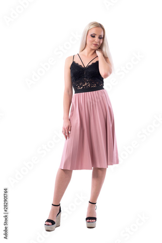 looking down, thoughtful, thinking, modern, style, woman, pensive, girl, fashion, isolated, full body, white background, people, trendy, summer, young, youth, skirt, elegance, beautiful, pretty, female, femininity, full-length, apparel, urban, pink, blond, caucasian, studio, cut-out, top, lace, black, long hair, salmon, colours, sandal, platform, fashion model, fashionable, person, lifestyle, high heel, standing, pleated, aspiration, anticipation