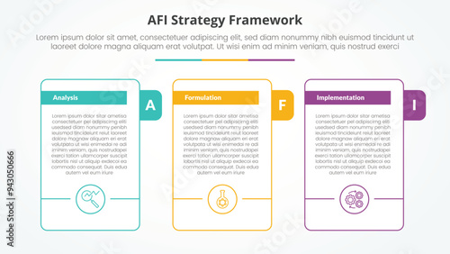AFI framework strategy infographic concept for slide presentation with big outline table with title badge and circle accessories bottom with 3 point list with flat style