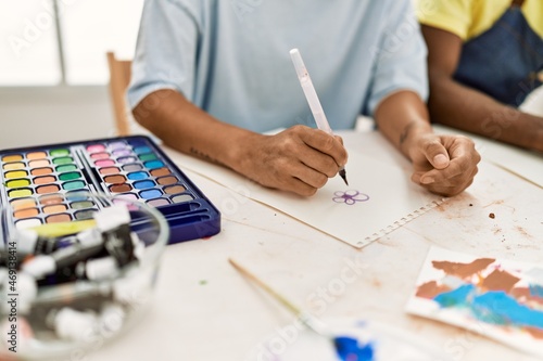 African american artist couple painting sitting on the table at art studio.