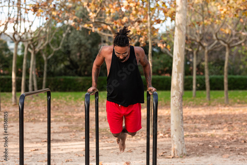 african american athlete boy does calisthenics fitness exercises on bars in park