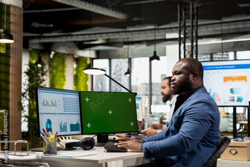 african american, adviser, monitoring, forecast, datum, business, productivity, male, employee, corporate, analyst, situation, infographic, progress, efficiency, isolated, copy space, chroma key, screen, display, computer, monitor, office, strategy, planning, chart, graph, technology, workspace, manager, forecast, vision, development, icon, management, professional, black, digital, workplace, success, project