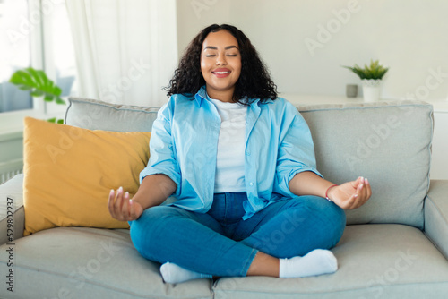 woman, meditation, meditating, african american, sofa, sitting, young, peaceful, eyes closed, relaxing, lifestyle, beauty, mindfulness, comfort, black, relaxation, female, relaxed, clothes, adult, home, yoga, concept, indoor, size, leisure, happy, domestic, large, person, fats, overweight, lady, smile, background, weight, people, couch, weekend, casual attire, 20s, house, 1, feminine, calm, zen