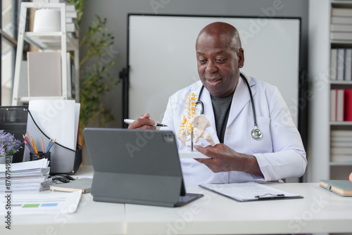 African American male doctor working in clinic at desk using laptop in medical coat and stethoscope. organ specialist The patient's anatomy, treatment methods, medical treatments.