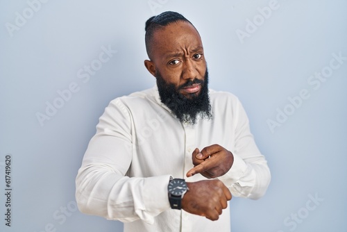 African american man standing over blue background in hurry pointing to watch time, impatience, upset and angry for deadline delay