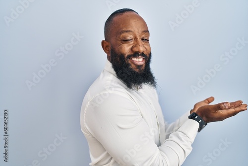 African american man standing over blue background pointing aside with hands open palms showing copy space, presenting advertisement smiling excited happy