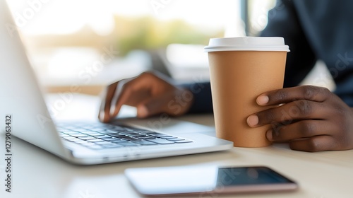 African American Man Using Laptop and Holding Coffee Cup on Desk Indoors