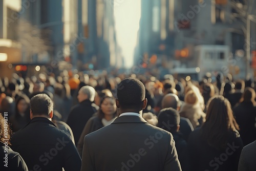 city landscape, city street, skyscraper, business district, crowd, people, pedestrian, rush hour, commuting, anonymous, backview, suit, businessman, professional, man, male, dark-haired, african american, city life, metropolitan, blurred background, depth of field, urban setting, modern architecture, city landscape, walking, street scene, sunlight, shadow, movement, dynamic, daytime, bright light