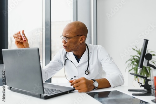 African american scientist in white coat holding and examining test tube with reagent, laboratory researcher concept