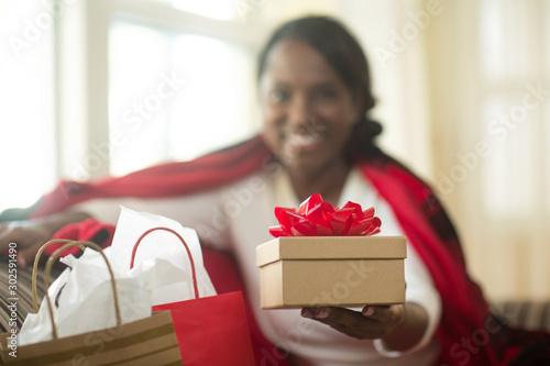gift, woman, christmas, present, box, young, happy, birthday, beautiful, surprise, holiday, celebration, happiness, isolated, people, smiling, white, holding, smile, red, portrait, beauty, person, giving, cheerful, mature woman, african american, diversity, older, black, copy space, home, sofa, elegant, 50's