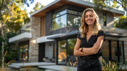 african american woman real estate agent or buyer stands outside a modern home
