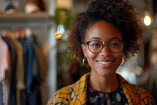 African American woman with a bright smile, wearing glasses, standing in a clothing store. Stylist or boutique owner, small clothing business