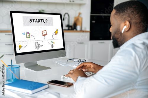African American young adult successful man sitting at desk with computer, working on new startup, planning idea and strategy