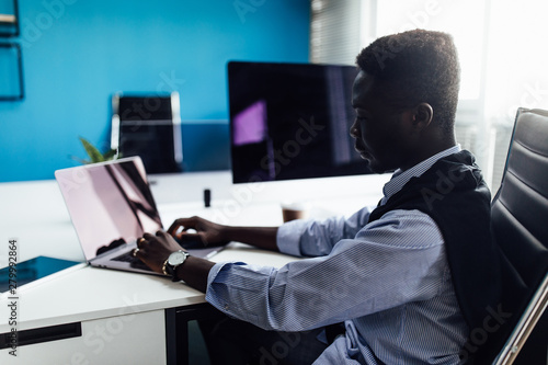 African businessman is working seriously with his laptop computer screen and typing notes.