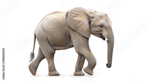 elephant, african, wildlife, animal, mammal, walking, gait, trunk, tusk, ear, grey, skin, white, background, isolated, large, wild, nature, zoo, safari, africa, savanna, jungle, herbivore, powerful, strong, gentle, intelligent, endangered, conservation, photo, image, photo, fauna, portrait, side, profile, closeup
