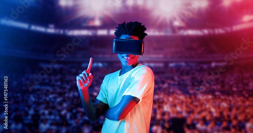 virtual, reality, ar, technology, ai, artificial intelligence, gui, hologram, three-dimensional, fun, excited, game, gamer, gaming, player, innovation, futuristic, goggles, playing, headset, man, digital, cyberspace, computer, entertainment, wireless technology, simulator, simulation, device, cyber, play, student, goggles, african, afro, stadium, event, arena, fisheye, competition, sports team, team sport
