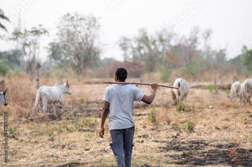 african herdsman rearing cattle, watching over as they graze in the bushes
