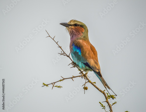 African lilac breasted roller (fork-tailed roller, lilac-throated roller, Mosilikatze's roller) is national bird of Kenya , isolated and perched on a tree