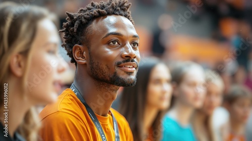 African male adult smiling in group setting with caucasian young adults in background