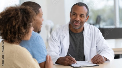 african, male, doctor, couple, consultation, medicals, health care, communication, smiling, adult, diverse, office, interaction, patient, listening, mature, professional, advising, notepad, pen, clinic, teamwork, meeting, diagnosis, advice, friendly, exam, service, treatment, indoor, care, trust, comfort, appointment, discussion, expertise, patient, support, human relationships, understanding, collaboration, reassurance, connection, empathy, guidance, wellness