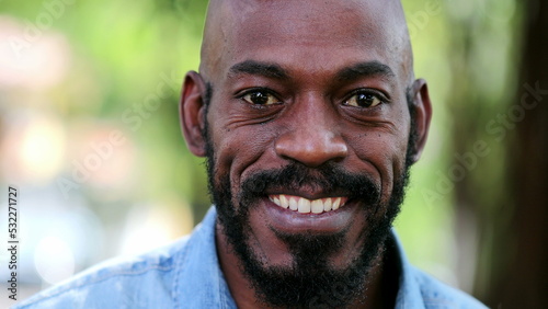African man smiling standing outside. Black person portrait face close-up