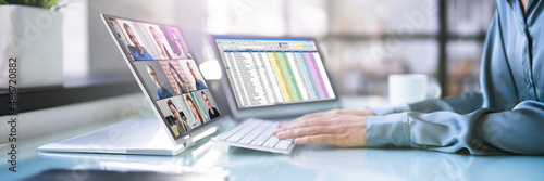 conference, video, african, monitor, call, hybrid, office, american, screen, black, woman, remote, business, online, spreadsheet, meet, tablet, banner, background, panoramic, copy, space