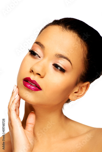 african, portrait, woman, young, beauty, beautiful, make-up, skin, hand, touch, care, face, model, black, hair, brown, fashion, attractive, lip, sexy, american, glamour, coiffure, female, isolated, constructed, up, white, topless, shoulder, background, natural, make-up, people, 1, woman, style, extension, ethnic, lady, sensual, race, sensuality, human, head, purity