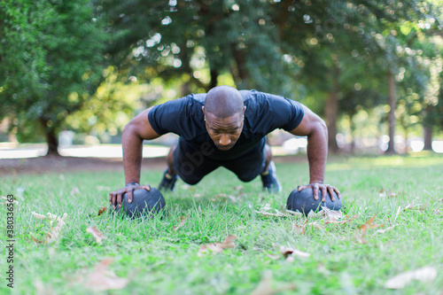 African-American man doing push-ups on slam balls
