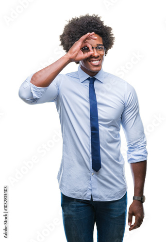 Afro american business man wearing glasses over isolated background doing ok gesture with hand smiling, eye looking through fingers with happy face.
