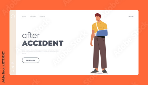 After Accident Landing Page Template. Unhappy Man with Hand Fracture. Injured Male Character with Broken Arm in Bandage