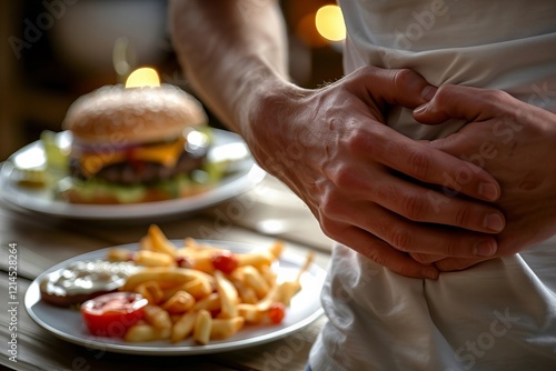 heartburn, dyspepsia, man, stomach, vomit, woman, fast food, meal, food, eating, abdominal pain, unhealthy, avoid, pain, nausea, plate, digestive, burger, sick, people, fast, discomfort