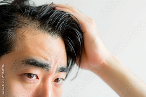生え際の薄毛に悩む男性(AGA・男性型脱毛症・若ハゲ・M字ハゲ・はげ・育毛剤)
