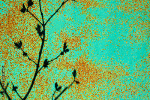 AgeAged turquoise blue green weathered background with cracks, spots and rust or grunge rough surface backdrop with tree shadow.