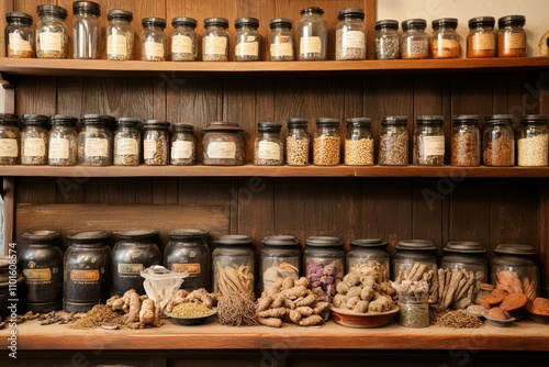 herb, jar, spice, apothecary, shelf, vintage, antique, wooden, storage, collection, ingredient, medicine, remedy, natural, traditional, organic, dried, root, powder, seed, grain, container, label, old, dusty, pharmacy, botany, herbalism, alternative, cabinet