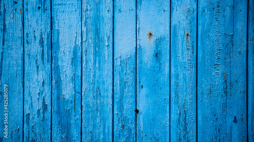 Aged blue planks with peeled paint. Blue background. Close-up. Copy space. Defocus.