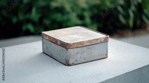 box, metal, rust-eaten, aged, tin, container, square, storage, antique, vintage, collectable, gift, display, rustic, weathered, preservation, cardboard box, retro, craft, decoration, memory, garden, park, stone, concrete, surface, grey, closeup, object, still life, photo, image, design, artwork, rust, decor, present, old