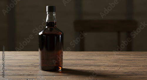 Aged Spirits Bottle Presents Deep Amber Color On Rustic Wood Surface