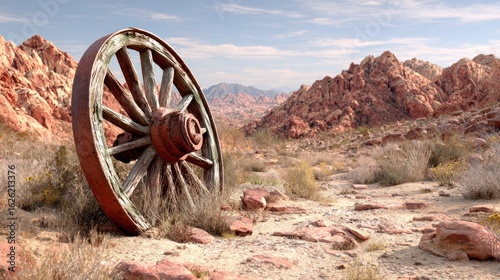 wheel, wagon, desert, landscape, mountain, rock, rust-eaten, weathered, arid, terrain, antique, historical, nature, exploration, ruin, abandoned, vintage, travel, adventure, red, brown, sand, rocky, dry, scrub, vegetation, path, horizon, light, sun, sky, cloud, mountain, vale, view, worn, detail, texture, beauty, still, life, outdoors