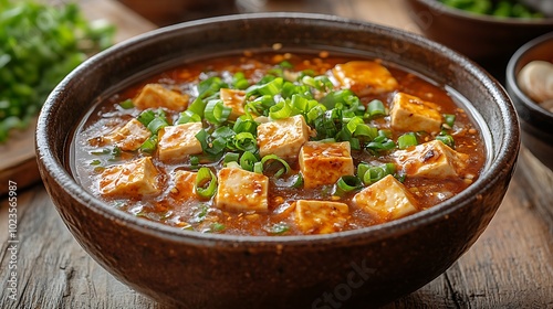 Agedashi Tofu in Dashi Broth: Crispy, fried tofu cubes served in a warm dashi broth, topped with finely sliced green onions and bonito flakes, presented in a deep, traditional bowl.