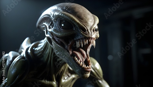 alien, creature, monster, extraterrestrial, science fiction, science fiction, horror, fantasy, aggressive, angry, scarey, fear, teeth, fang, mouth, open mouth, closeup, portrait, dark, shadowy, mysterious, cinematic, dramatic, film, motion picture, game, video game, threat