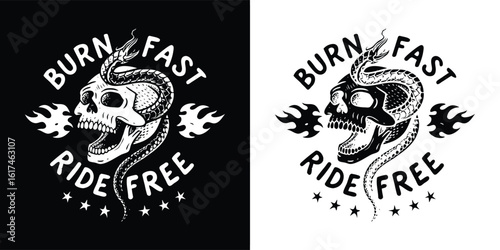 Aggressive skull with coiled snake, flames, and “Burn Fast Ride Free” slogan in bold tattoo style for biker t shirt design