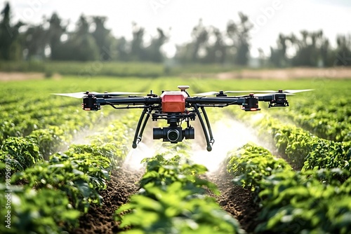 Agricultural drone flying over a field of crops, spraying pesticides or fertilizers. The drone is equipped with a camera and sensors for precision agriculture