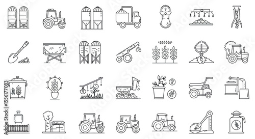 agriculture, machinery, equipment, farm, line, vector, tractor, truck, cultivation, harvesting, tool, transport, planting, innovation, irrigation, technology, grain, crop, container, gardening, outline, rural, farming, fertilizer, modern, agribusiness, plough, landscape