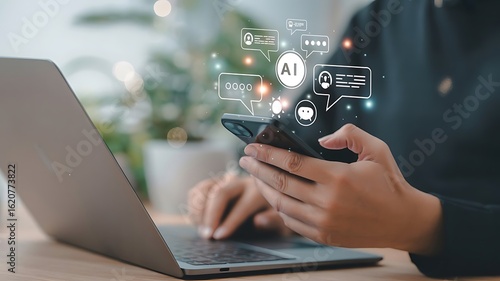 AI Artificial Intelligence, Digital chatbot, Woman chatting with chatbot customer service on mobile phone via internet mobile app. Automatic conversation assistance by AI chatbot technology..