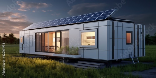 AI Generated. AI Generative. Camp van car house home rv transport with solar panel. Adventure travel outdooe nature van life with alternative electricity. Graphic Art