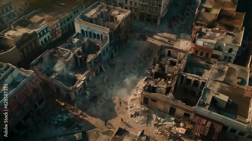 city landscape, devastation, apocalypse, ruin, skyline, desolation, debris, destruction, abandoned, decrepit, desolate, collapsed, urban, wasteland, deserted, dilapidated, debris, forlorn, aftermath, decrepitude, ramshackle, shattered, bombed, broken, forsake, neglected, barren, ruined, wreckage, ai, generative, illustration, digital, art