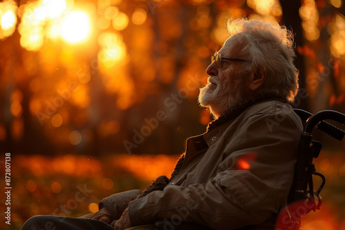 ai, art, artificial, generative, graphic, illustration, image, intelligence, portrait, 116, care, chair, day, disability, disabled, disease, health, health care, ill, medicine, pain, recovery, rehabilitation, therapy, trauma, treatment, unwell, well-being, wellness, wheel, wheelchair, nature, outdoors, walk, evening, sunshine, sunset, park, composite, smile, happy, male, man, age, old, elderly, mature, pensioner