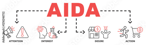 AIDA banner web icon vector illustration concept for attention interest desire action with icon of promotion, target, vision, store, ecommerce, and buying