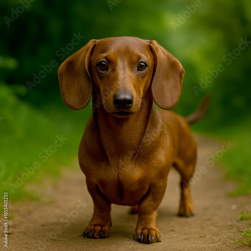 AI-generated image of a sleek brown Dachshund standing on a forest path, its long body and short legs highlighted against a lush green background.