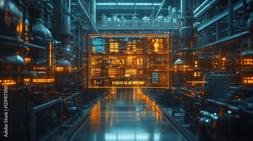 AI-powered food processing plant with smart ingredient tracking, holographic quality control screens analyzing nutrient composition, futuristic digital factory design
