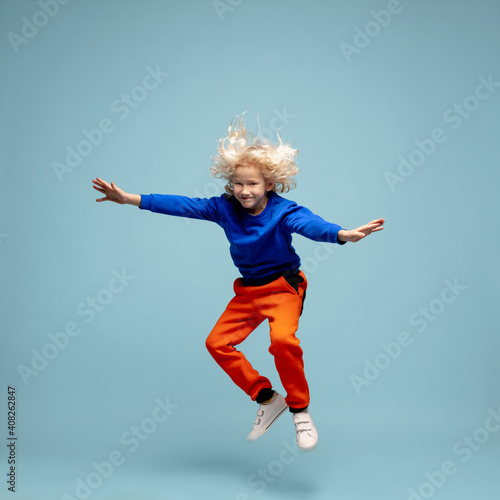 Air riding. Happy curly boy isolated on blue studio background. Looks happy, cheerful. Copyspace for ad. Childhood, education, emotions, facial expression concept. Jumping high, playing, having fun.